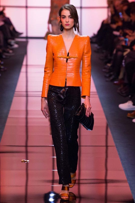 5- السترة الجلدية باللون البرتقالي الذي خيم على أغلب تصاميم الدار هذا العام كان رائعاً مع السروال الأسود اللامع.