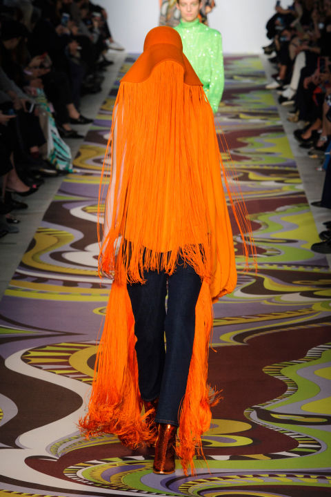 من أزياء (بوتشي) هذا العام والذي تميز بظلالة البرتقالية المنسدلة في خيوط منسابة من أعلى الرأس.