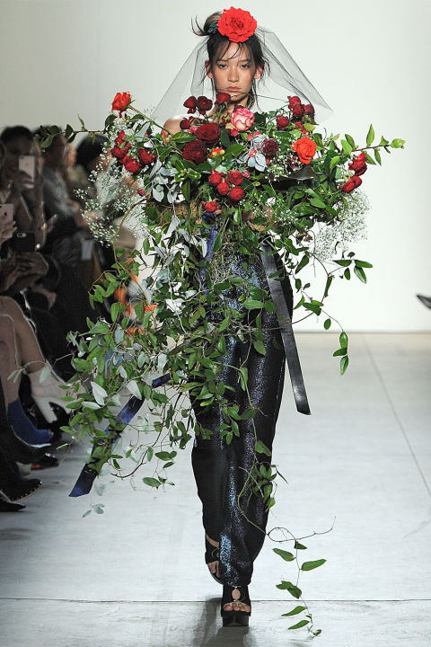 مع الجامبسوت الأسود بجلده اللامع, قرر المصمم إظهار التصميم بمزيد من باقات الورد المتفرعة من جميع الجهات.