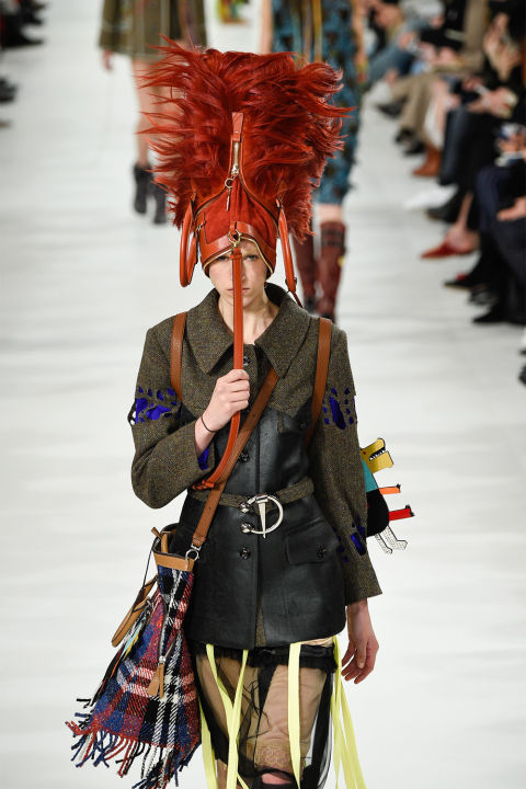 اعتمد المصمم في هذه الاطلالة على الالوان الكاروهات او متعددة المربعات في الحقيبة مع الخوذة الرومانية المرتفعة بالريش الأحمر.