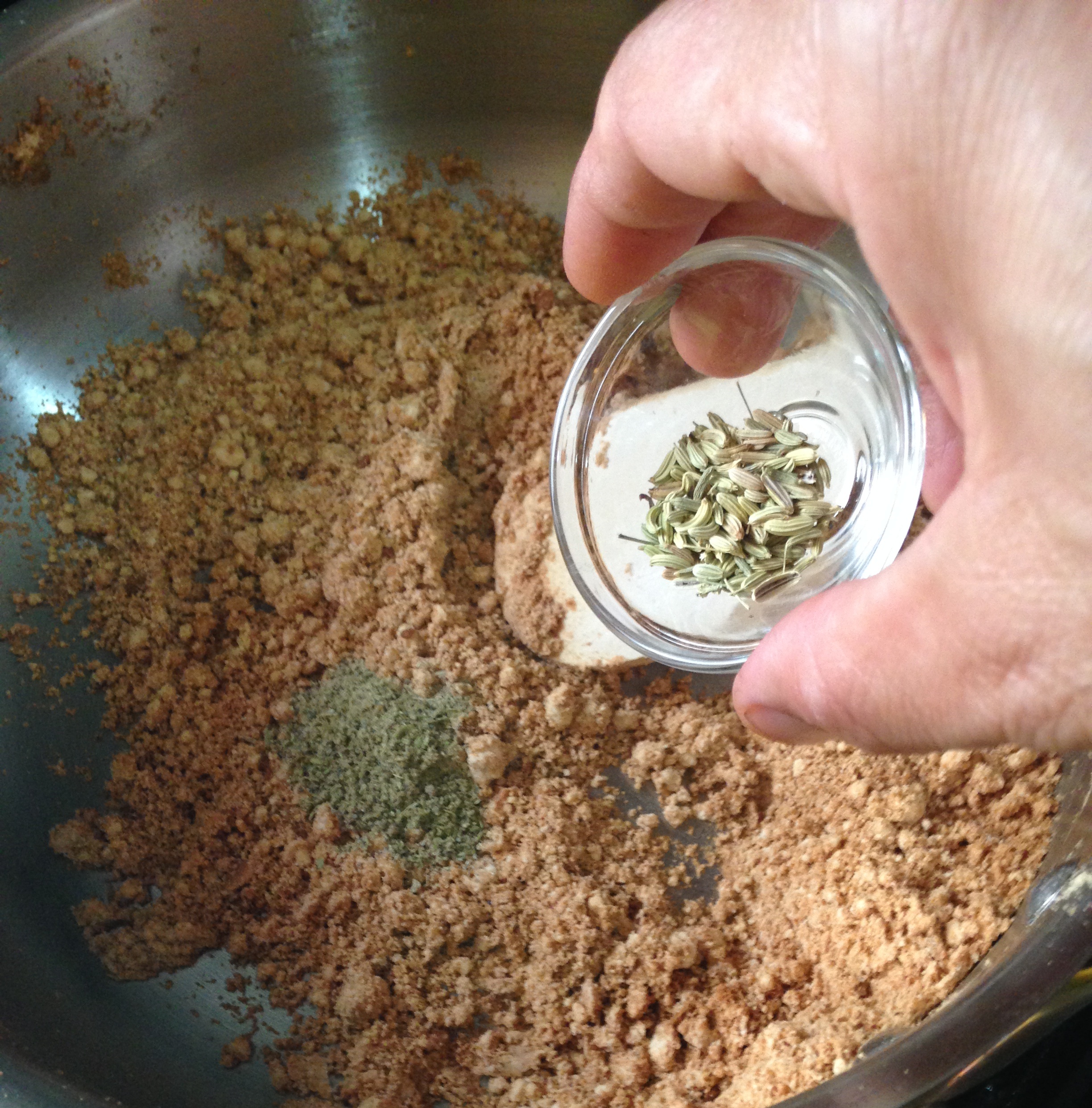 نضيف البهارات المذكورة وكوب الدقيق السابق تحميره ونخلطهم حتى يتجانسوا.