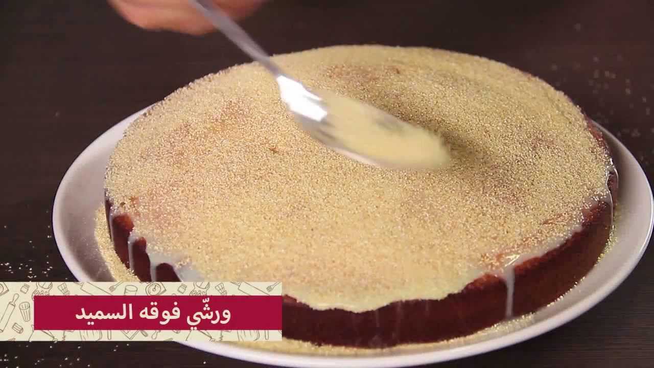 بعد أن تبرد تماما نصب عليها الحليب المكثف المحلى ومن فوقه السميد المحمس.
