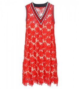الطول واللون الأحمر والوقار في هذا الفستان الرائع من الدانتيل.