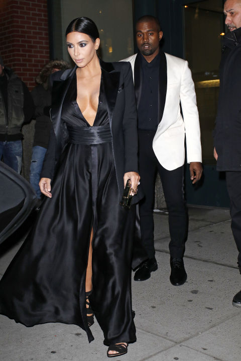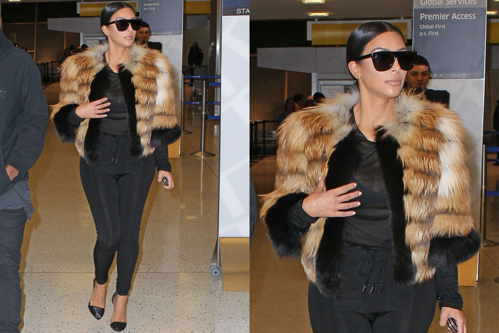 يناير 2015، أثناء مغادرتها مدينة نيويورك وهي في المطار: ارتدت كيم فستان أسود ضيق ومفتوح من منطقة الصدر وعليه معطف أنيق من الفرو وقد وجد الكثيرون إطلالتها لا تتناسب مع شخص يحاول السفر.