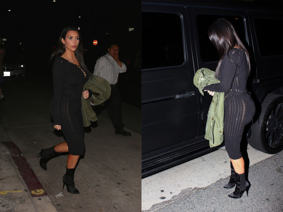 يناير 2015، سانتا مونيكا: أثناء خروجها ليلا في سانتا مونيكا بصحبة زوجها مغني الراب الشهير كانييه ويست شاهدنا كيم وهي ترتدي هذا الفستان الأسود المثير وحذاء أسود طويل ويبدو أنها تفضل اللون الأسود والأحذية السوداء الطويلة في إطلالتها.