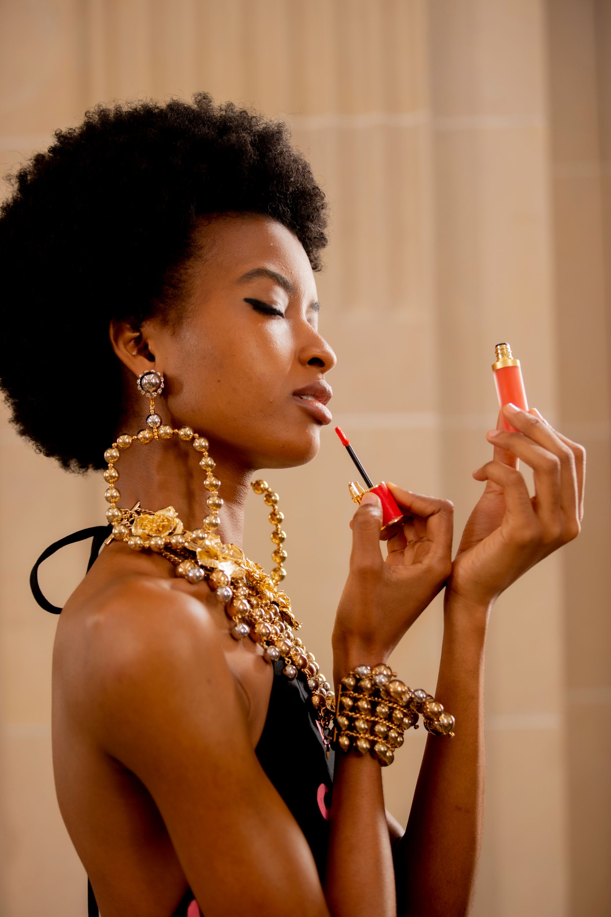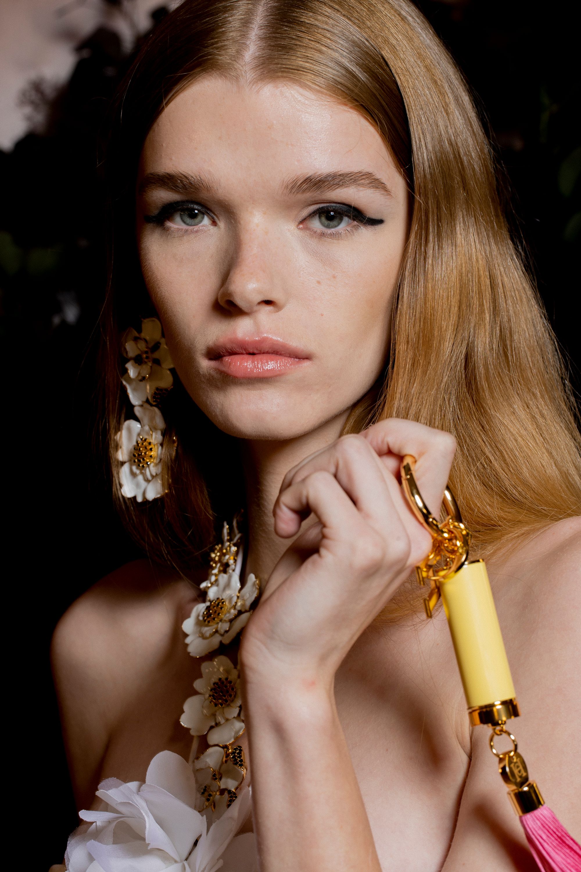 بينما يمكن استعمال التركيبات الكامدة والغنية لمستحضر بيري فيتش (رقم 510) وأليجريا (رقم 410) مع الفساتين الانسيابية وأنماط الخياطة المتنوعة، حيث ساهمت هذه الإبداعات في منح الإطلالات مزيداً من العمق اللوني والتعبير عن العفوية المتأصلة في تاريخ العلامة. في حين يظهر أحمر الشفاه السائل بقوام الفينيل كلمسة نهائية تضفي لمعاناً مشرقاً على العرض. ولا تخلو الإطلالات من أحمر الشفاه الشفاف نيود سمايل (رقم 140) أو فابيولوس (رقم 144)، واللذين أضفيا لمسةً طبيعيةً تنبض بالفخامة.