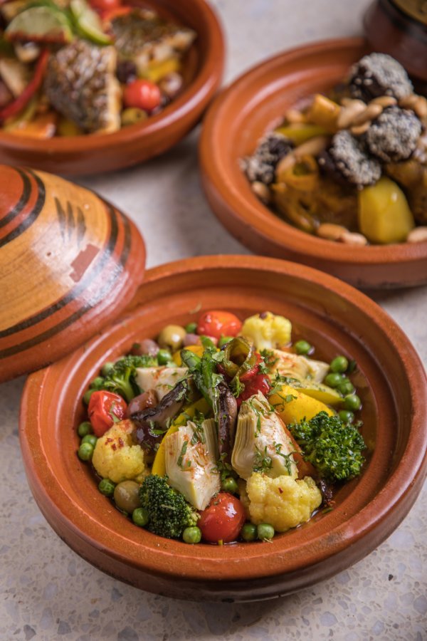طاجن سمك الدنيس (سيبريم) – يُطهى سمك الدنيس (سيبريم) الطري على نار خفيفة مع طماطم الكونكاسيه المجفف تحت أشعة الشمس مع البصل والفلفل الحلو والليمون والزيتون الأسود اللامع. طبق رئيسي في المغرب.
