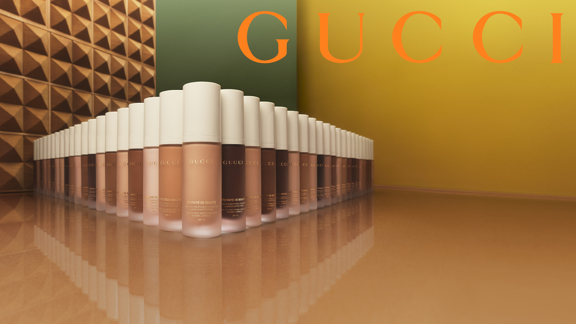 صُمِّمت هذه الدرجات لتعكس اللون نفسه غير اللامع لكريم الأساس الموجود داخل كلّ منها. أما زجاجتها غير الشفافة والأنيقة، فهي مغطاة بغطاء عاجيّ ومزيّنة بشعار Gucci باللون ذهبي.