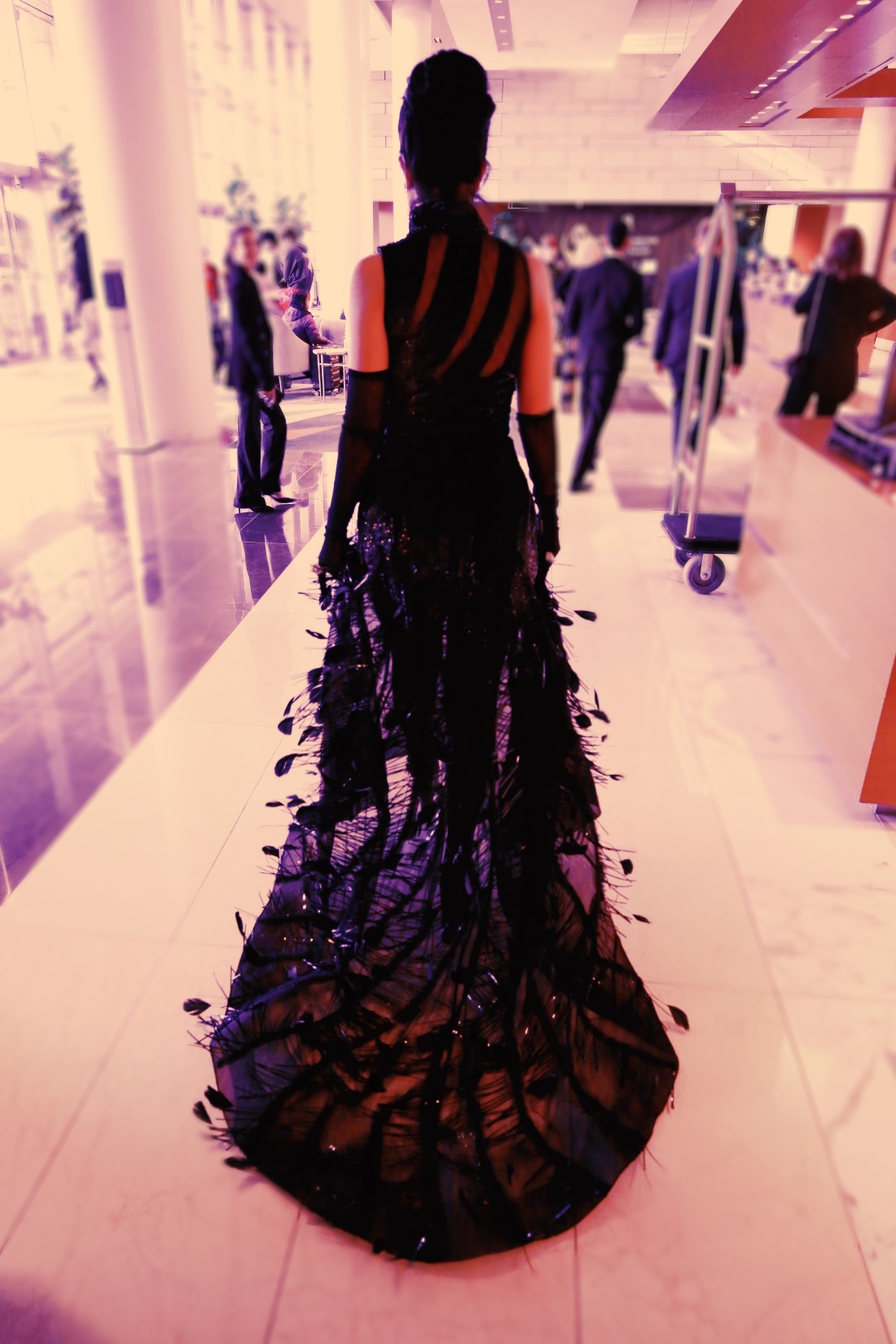 ولإضفاء لمسة دراماتيكية إلى اللوك، نسّقت مع الفستان قفازات سوداء شفافة، مما ساعد أيضًا على إبراز خواتم ماسية ساحرة من تصميم “بوشرون”، إضافة إلى الأقراط.