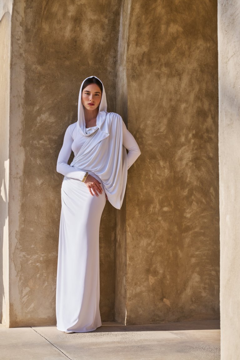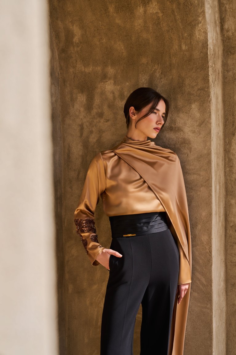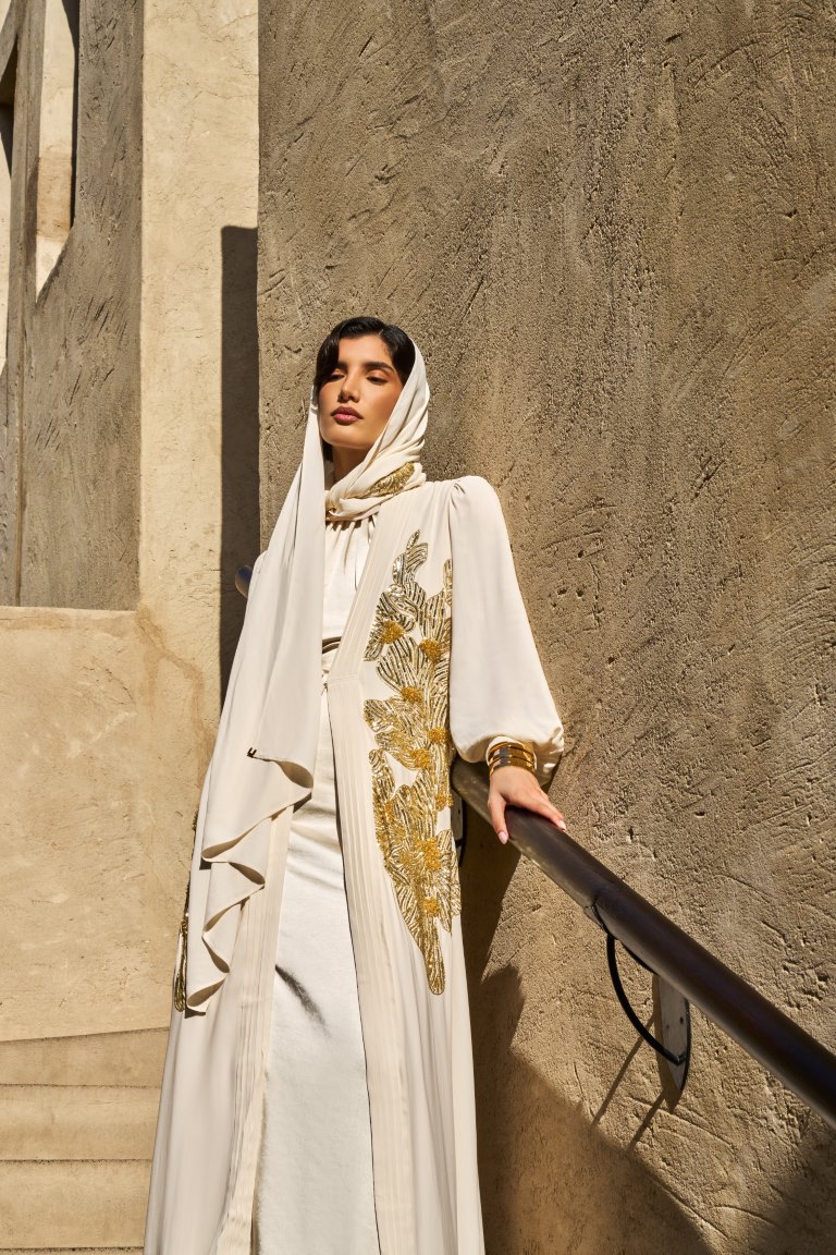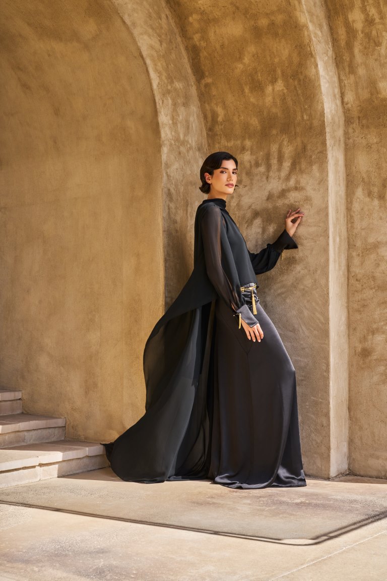 تتألق المجموعة بلوحة ألوان مضيئة؛ تتدرج من الأصفر الزبدي الهادئ وصولاً إلى الأسود العميق، مرورًا بدرجات النيود ولمسات مستوحاة من وهج الشمس. وتتجسد هذه اللوحة في خامات من الكريب دي شين والساتان والجورجيت، والشيفون المختارة بعناية لخفتها وانسيابيتها الفائقة. وتتنوع القطع بين قصات ناعمة وخطوط تحتضن الجسد برقة لتشمل القفاطين والعبايات والأطقم المتناسقة، وفساتين السهرة؛ وكلها تزدان بتطريزات متقنة وتفاصيل تحاكي بريق المجوهرات، ونقوش مستلهمة من الطبيعة، لتؤكد من جديد على براعة الدار الحرفية وتفردها.