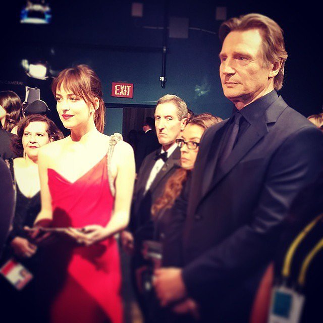 داكوتا جونز وليام نيسون في كواليس المسرح استعدادا لحلول دورهما في تقديم حفل الأوسكار.