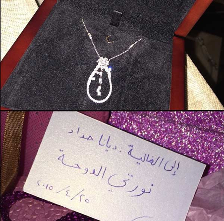 كانت الهدية عبارة عن عقد ماسي، وقد نشرت ديانا صورة للهدية، كتبت عليها: هدية جميلة من الصديقة الغالية نجلا.. شكراً حياتي على الهدية وعلى الضيافة الجميلة.. والله يوفقك في افتتاح المعرض في الدوحة الحبيبة..