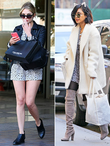 آشلي بينسون وفانيسا هادجنز: طريقتين مختلفتين لارتداء هذا الفستان الرائع من تصميم ” Michael Stars”، آشلي بينسون ارتدت هذا الفستان مع جاكت أسود أنيق وحذاء أسود انيق، وفانيسا هادجنز ارتدت هذا الفستان مع جوارب سوداء طويلة وحذاء رمادي ذو عنق طويل يصل إلى ركبتيها وجاكت أبيض طويل.