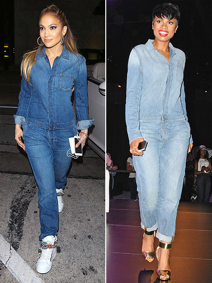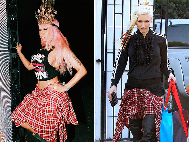 جوين ستيفاني ونيكي ميناج: قميص واحد وطريقتين مختلفتين لارتدائها: المغنية جوين ستيفاني ارتدت بنطلون جينز وبلوزة سوداء طويلة الأكمام وقامت بربط هذا القميص حول خصرها بطريقة أنيق، المغنية نيكي ميناج ارتدت هذا القميص كتنورة قصيرة مع توب أسود ضيق.