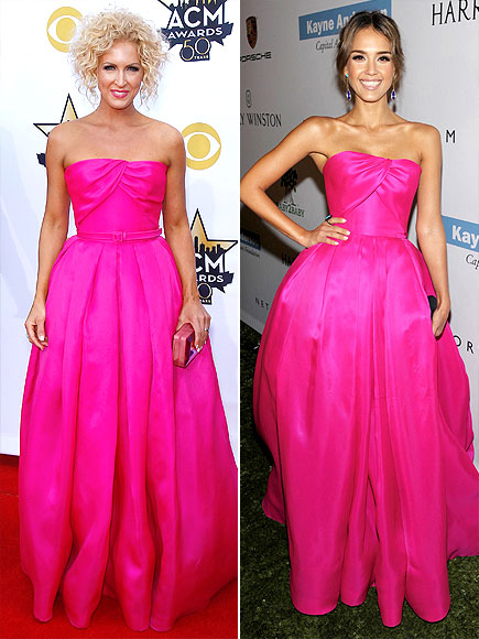 الممثلة جسيكا ألبا والمغنية كيمبرلي شلابمان (Kimberly Schlapman) كلاهما ارتدي فستان فوشيا جميل من تصميم مصممة الأزياء ريم عكرة، الفستانين متماثلين تماما وإذا كنت تريد أن تختار من ارتدي هذا الفستان بشكل أفضل فعليك أن تحدد ذلك عن طريق الاكسسوار الذي أضافته جسيكا أو كيم للفستان.