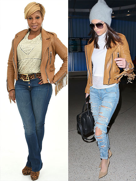 ماري جي بلايج وكيندال جينر: عارضة الأزياء كيندال جينر ارتدت هذا الجاكت البيج الجميل من تصميم ” Barbara Bui” على بلوزة بيضاء أنيقة وبنطلون جينز لون لبني فاتح، المغنية ماري جي بلايج ارتدت نفس الجاكت على بلوزة صفراء وبنطلون جينز ذو لون أزرق داكن.