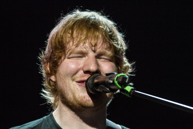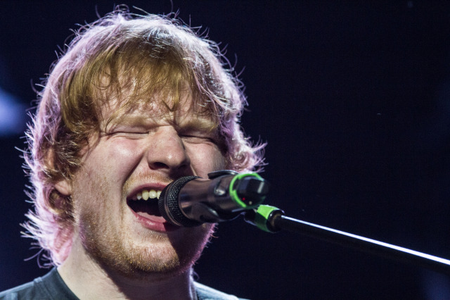إيد شيران بتعبير وجه طريف وهو يغني واحدة من أغنياته في حفل موسيقي.