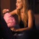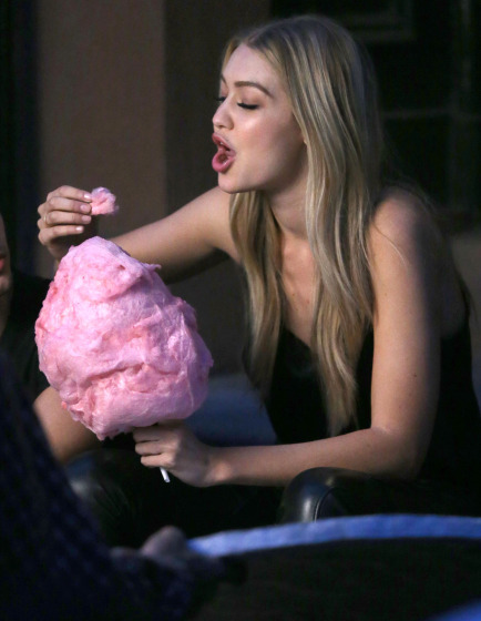 جيجي حديد وهي تتناول حلوى القطن ذات اللون الوردي.