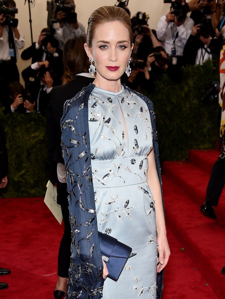 إيميلي بلنت: ارتدت فستان أزرق أنيق مصنوع من قماش الأورجانزا ومزخرف بقطع الزجاج والكريستال وكانت تحمل حقيبة أنيقة مزودة بإبزيم من الكريستال وكلاهما من برادا.